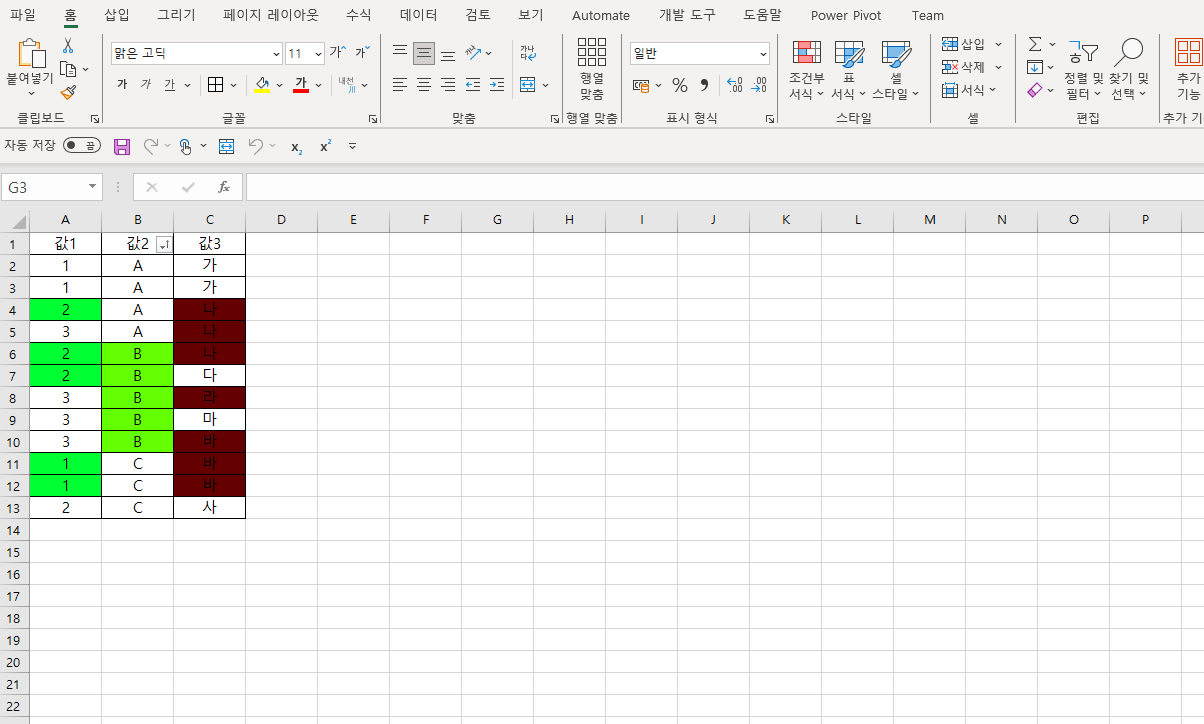이전 셀의 값과 다를 경우