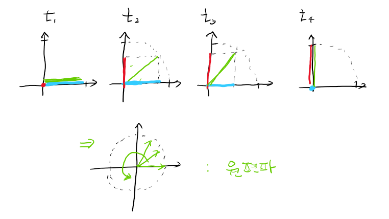 이런 경우, 아래처럼 전기력선의 궤적이 원을 그리게 되고, 진동방향의 회전방향에 따라 좌원편파, 우원편파로 구분된다.