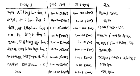 | 0. 무선통신 1. 무선 통신의 주파수 대역 ① VLF(Very Low Frequency), 장파(long wave) & LF(Low Frequency),저주파 ② MF(Medium Frequency), 중파(Medium Wave) ③ HF(High Frequency), 단파(Short wave) ④ VHF(Very High Frequency), 초단파 ⑤ UHF(Ultra High Frequency), 극초단파 ⑥ SHF(Super High Frequency), ⑦ EHF(Extreme High Frequency), 밀리미터파(Millimeter wave) |