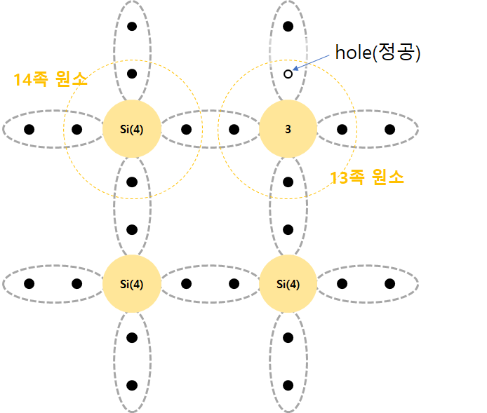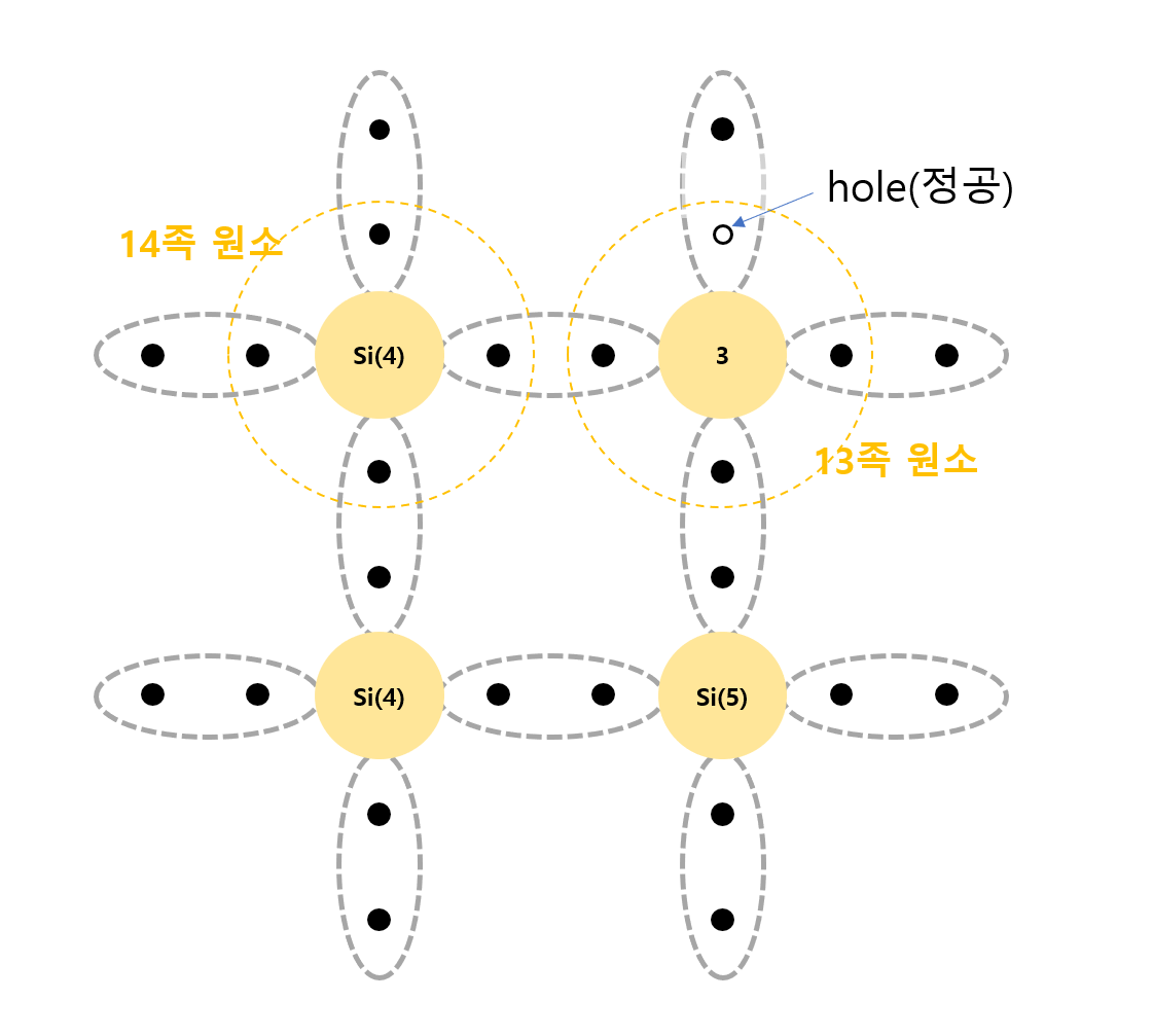 13족원소 1개를 진성 반도체에 도핑하면 1개의 정공이 생깁니다.