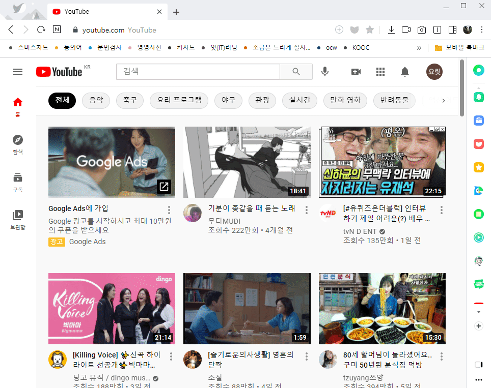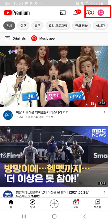 유튜브 메인화면 오른쪽 상단에 보이는