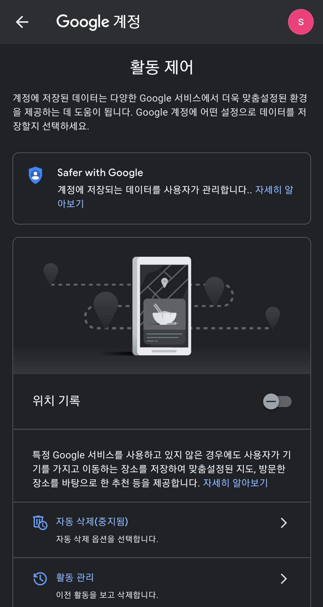 'Google 위치 공유', 'Google 위치 기록'이 사용 안함이라고