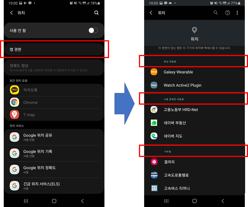 [위치]화면에서 '앱 권한'을 선택하면