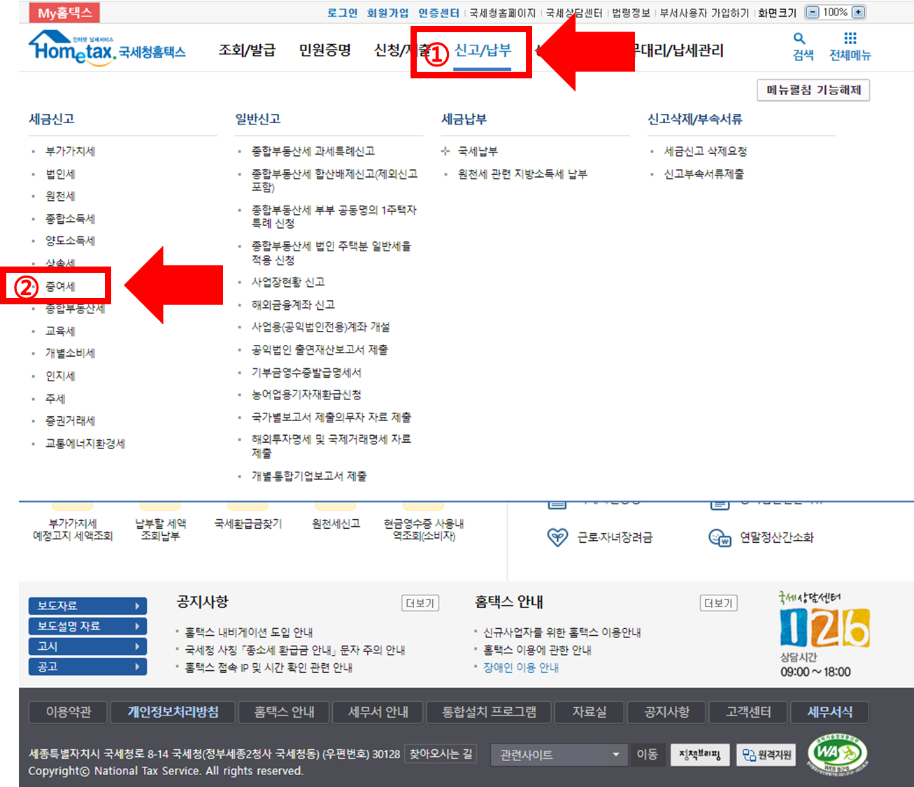 국세청 홈택스 홈페이지의 상단에 보이는