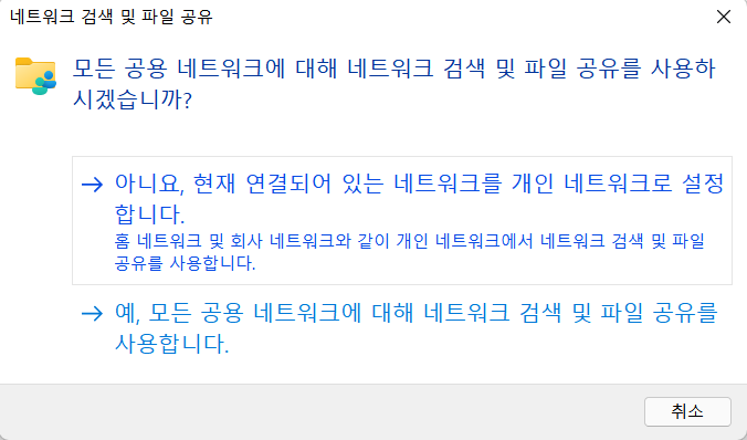 당연히 개인 네트워크로 선택하는 것을 추천한다.