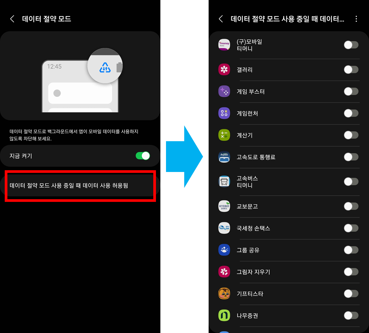 '데이터 절약 모드 사용 중일 때 데이터 사용 허용됨'을