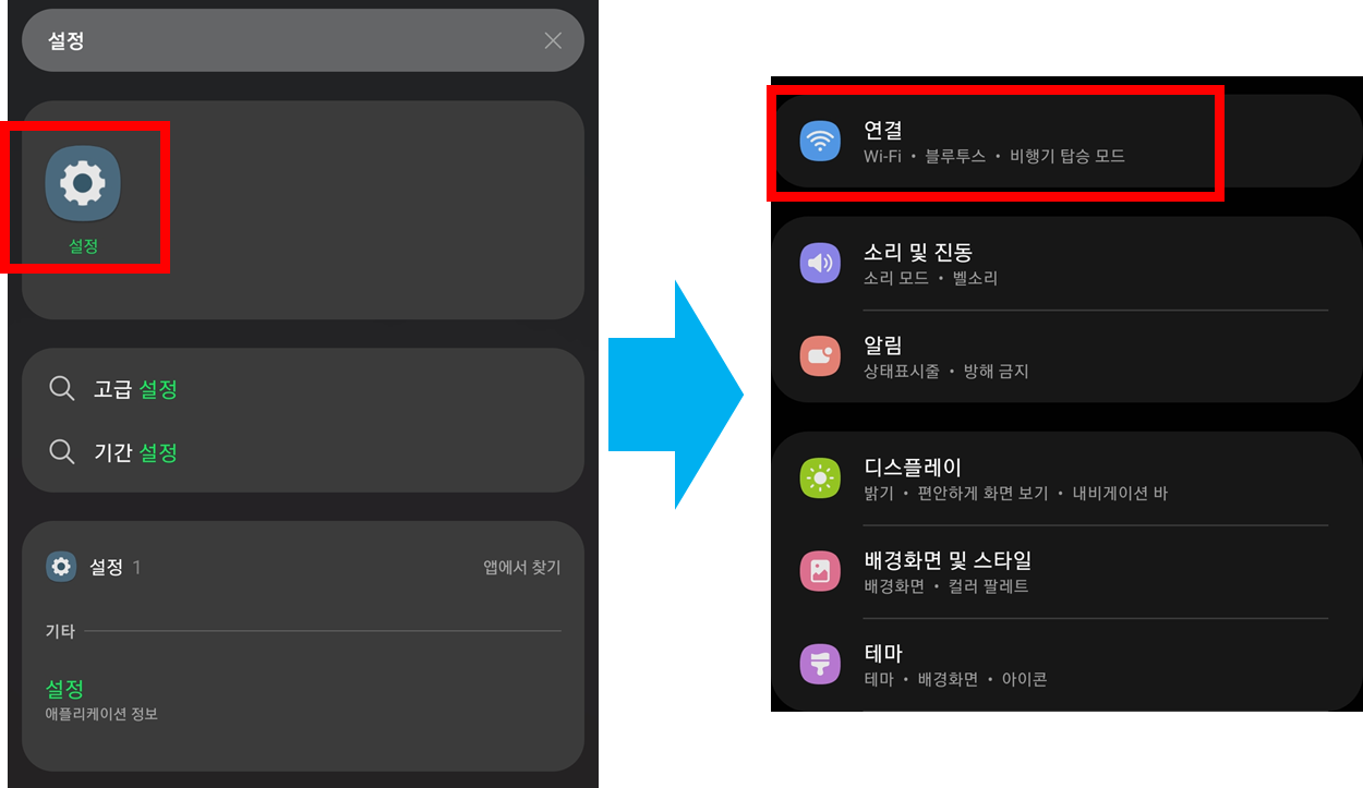 '설정' 화면에서 '연결' 항목을 선택한다.